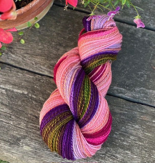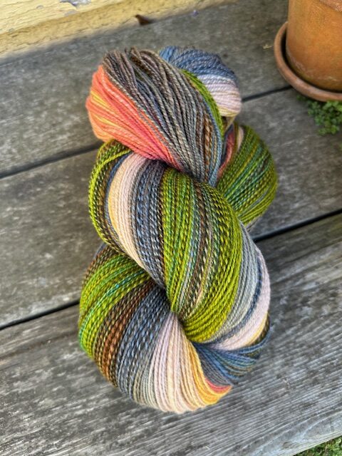 The pattern is Sarah Swett’s Magic Medium sweater, which is on Ravelry. The pattern has several modifications that can be made by the knitter, according to their body shape. The yarn is handspun by me, 2 ply, 1 strand of alpaca and 1 strand a very soft wool. The fiber was dyed by my friend Brenda of Pan’s Garden. The colors were inspired by a picture of a sunset I sent her. The yarn is about lace to dk weight. It was a fun knit.